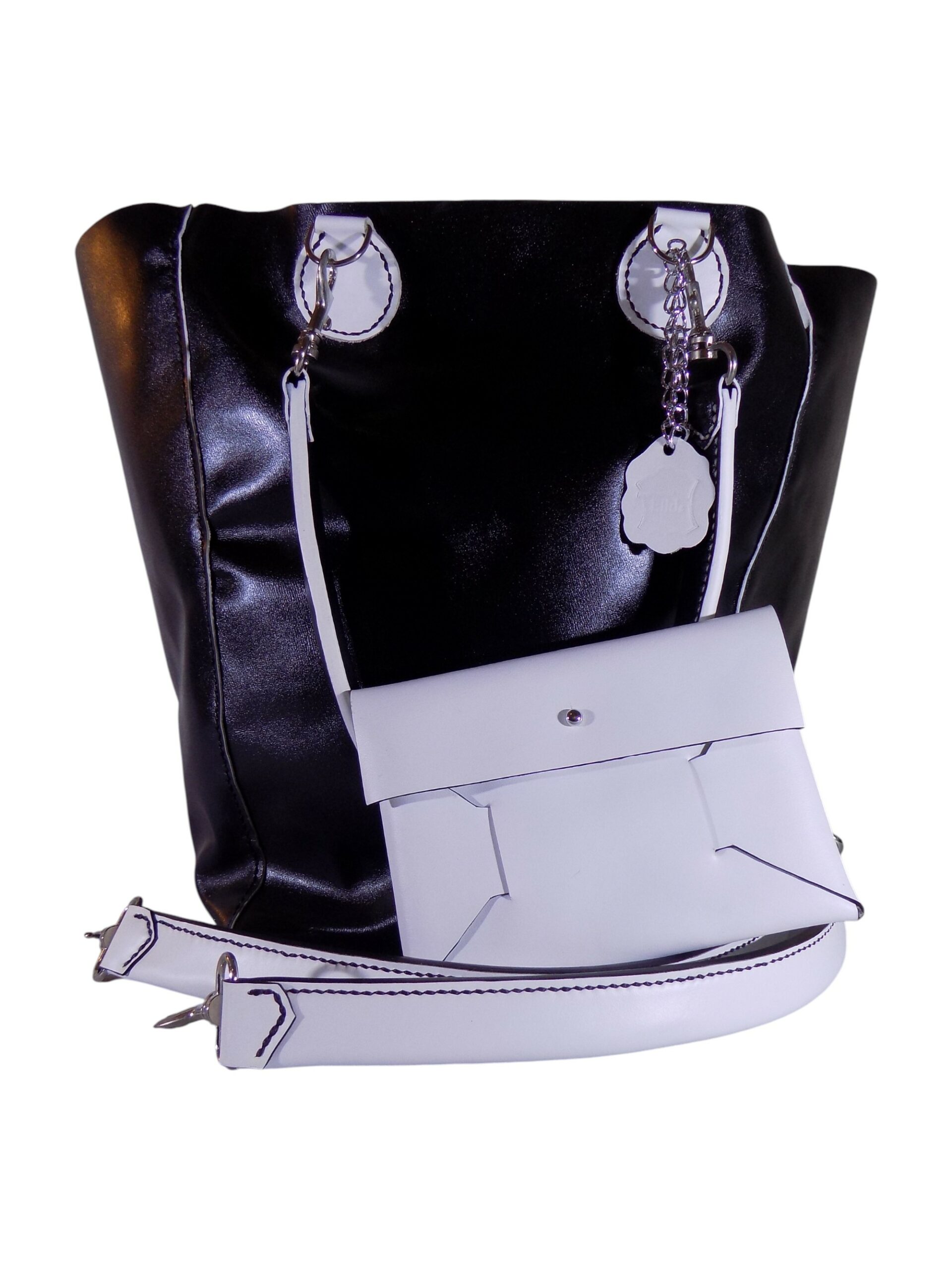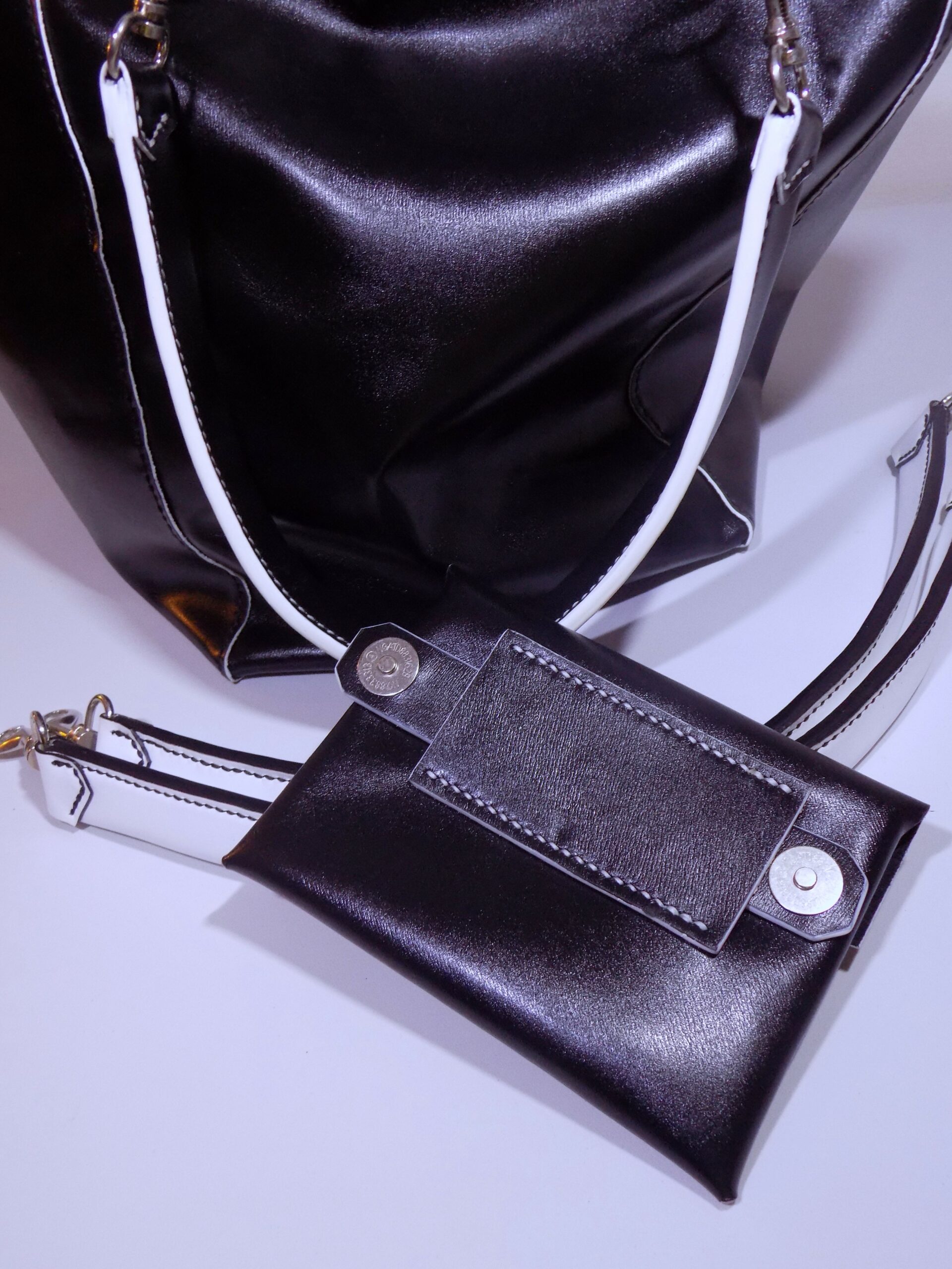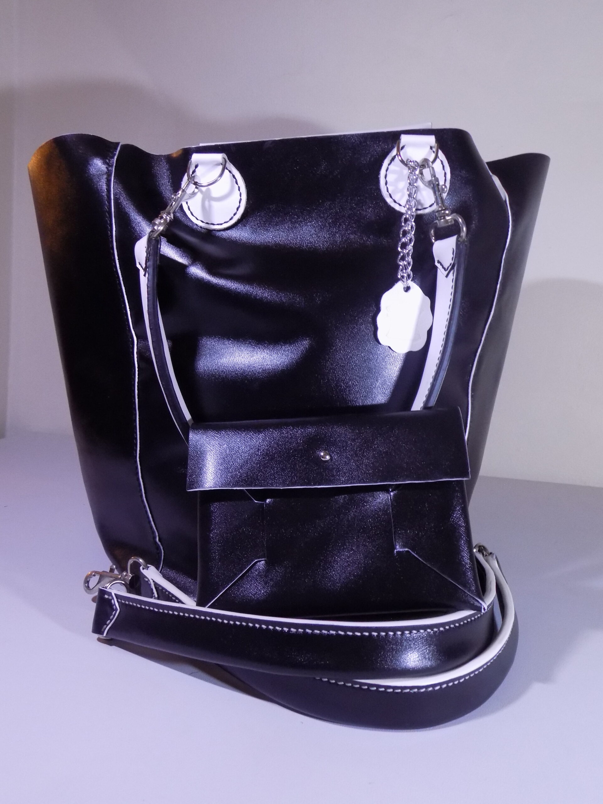 Laissez-vous séduire par ce sac cabas, réalisé en cuir de vache lisse Noir Brillant & Blanc, alliant sophistication et praticité !