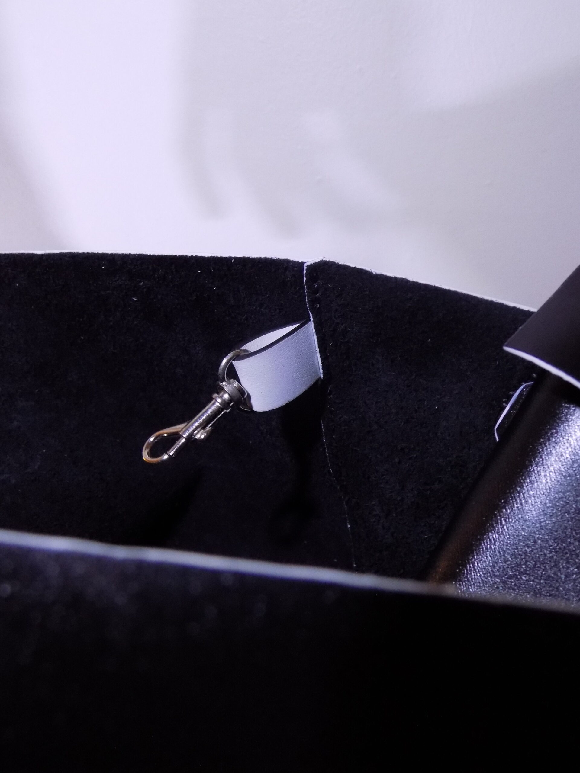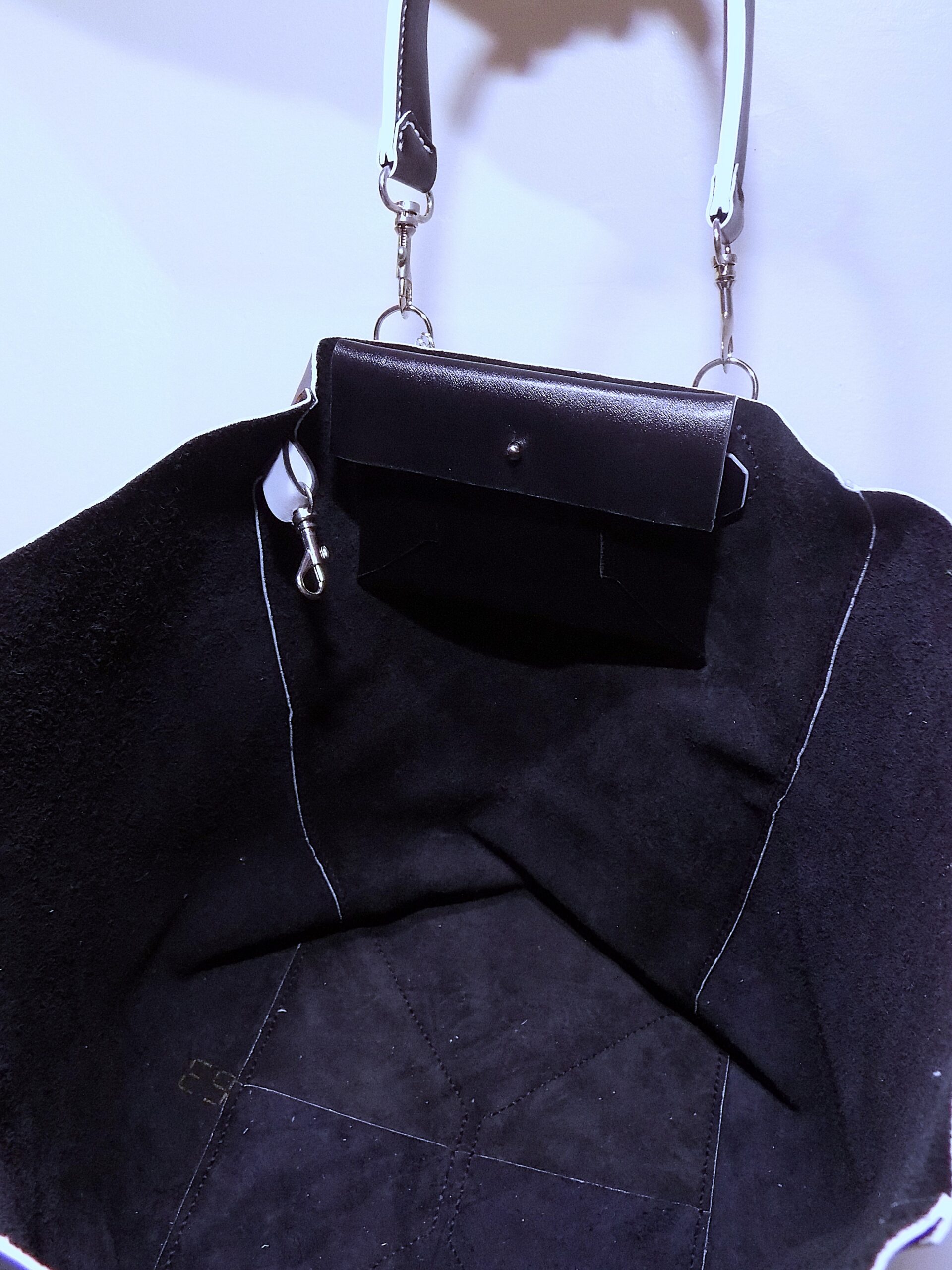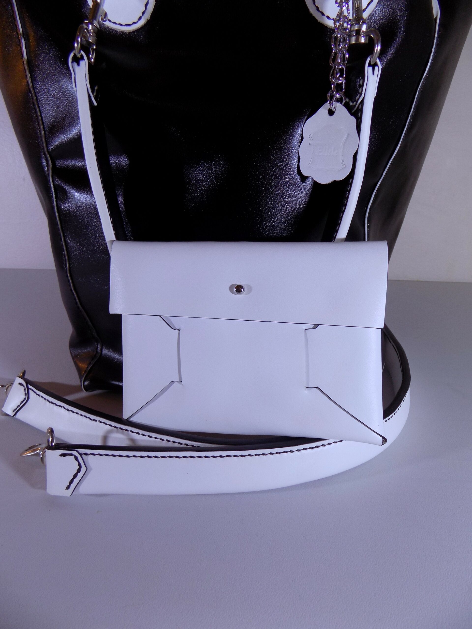 Laissez-vous séduire par ce sac cabas, réalisé en cuir de vache lisse Noir Brillant & Blanc, alliant sophistication et praticité !
